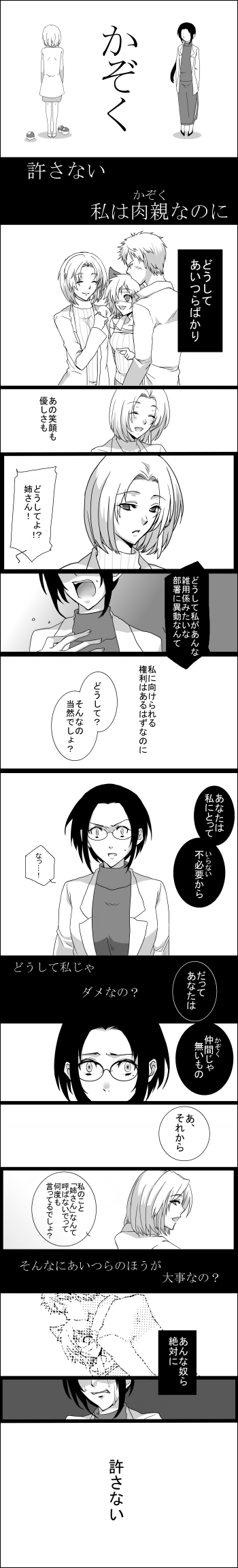 ママには妹がいるという設定はずっと考えてました。 あんまり深く設定は考えてませんが マスミはマユカの「子ども」を恨んでいて マユカはマスミを「家族」だと思っていない。 と、いう部分はかなり前から温めてました。 「あ、この人見たことある」と思った人は記憶を消去してください (黒歴史 ママが自分が「家族」を「選ぶ」ことに固執する いきさつとかも考えたいなぁ・・・。 実は小ネタ描く割にほとんど考えてないんだよなぁ・・・←